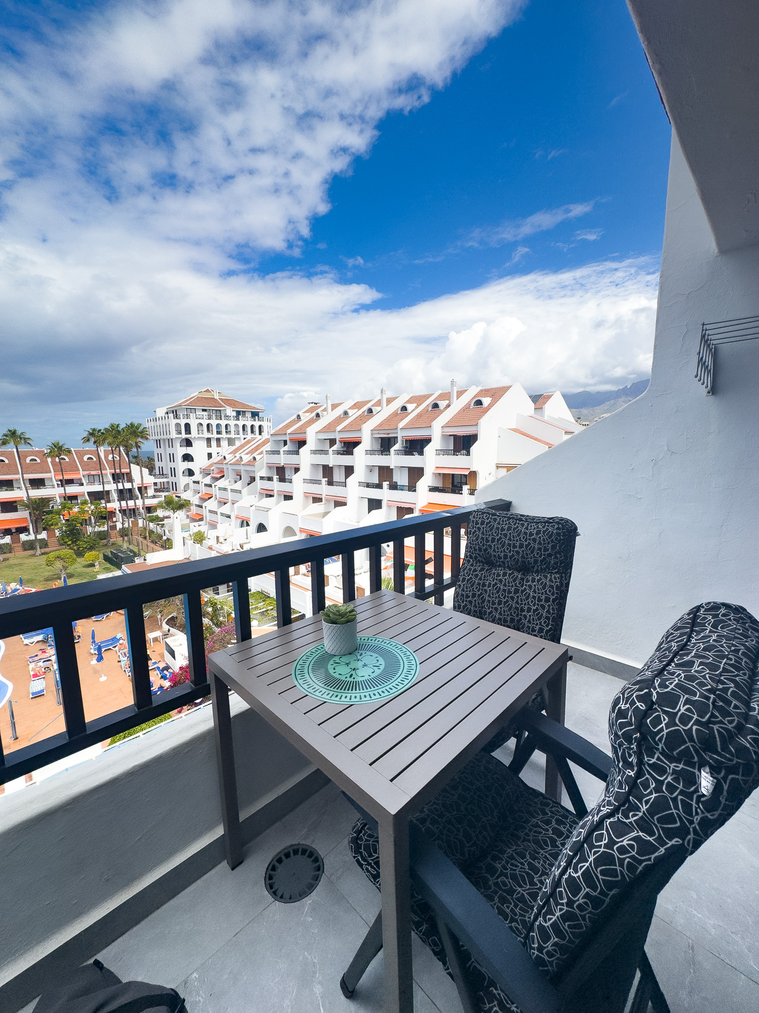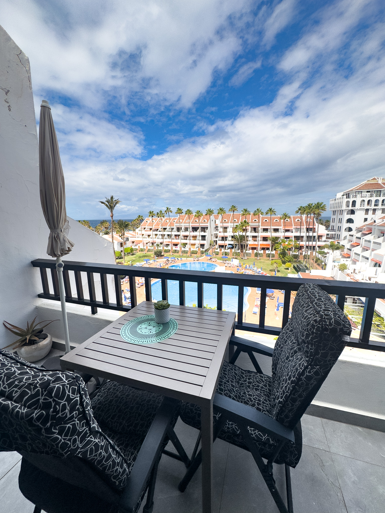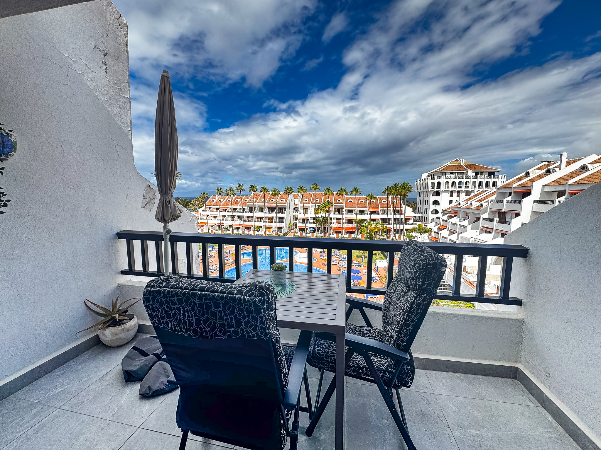 Enjoy the fantastic views from this 1 bedroom apartment in the heart of Las Americas in the famous and very popular Parque Santiago II complex. The apartment is close to shops, restaurants, entertainment and of course the beach (a couple of minutes walk) The apartment was recently renovated to a high standard with a modern design, large screen Smart tv with International channels. There is a balcony with outdoor furniture and great views over the pool and Ocean towards La Gomera. The upper floor bedroom is in 2 open sections, each with 2 single beds. In addition there is a sofa bed in the lounge. Please remember, 3rd floor no lift (yet).